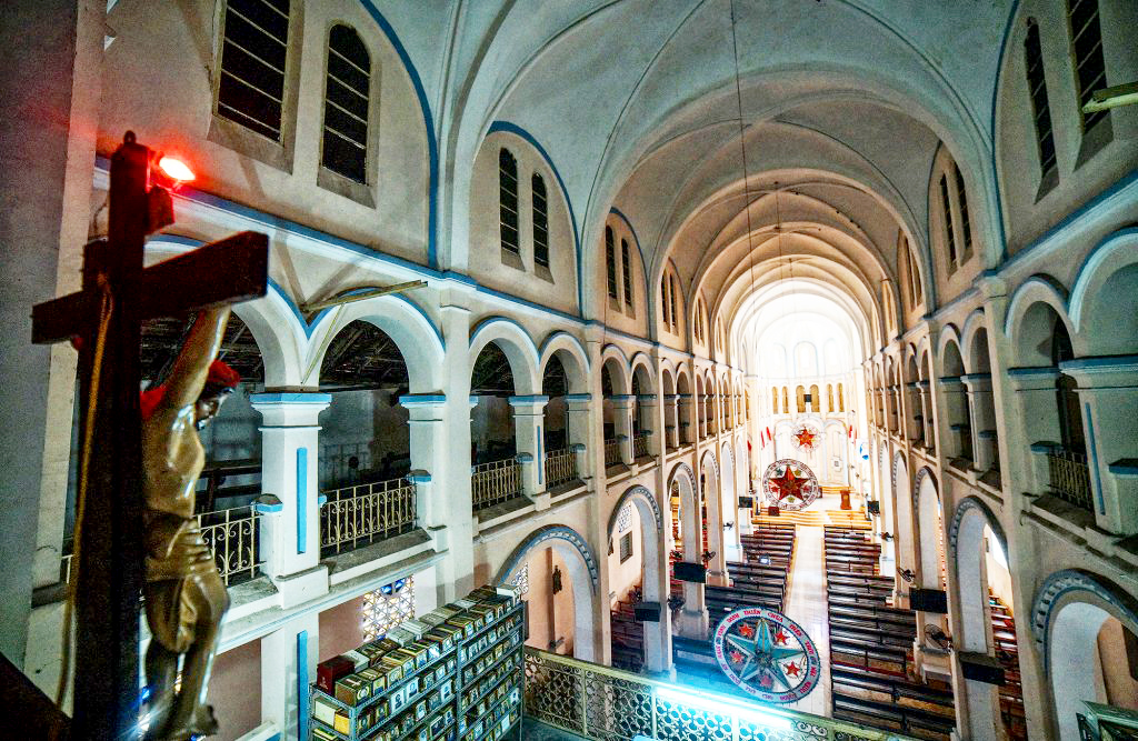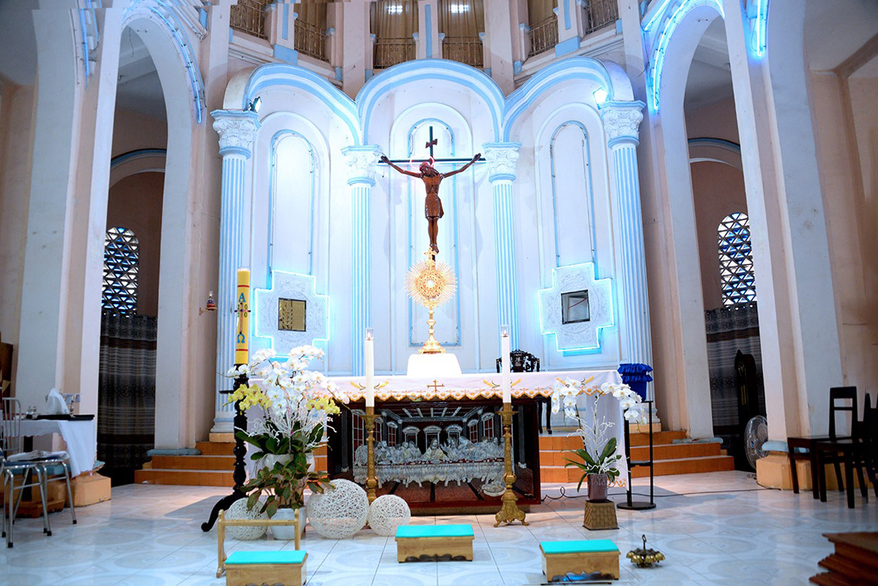 Phần cuối cung Thánh nhô ra tạo hình kiến trúc chữ thập nhìn từ trên cao. Bên trong có một tầng lửng chạy thành hình chữ U dọc theo giáo đường, nơi đây ngày xưa dành cho ca đoàn và giáo dân khi lễ quá đông, ngày nay chỉ dùng làm nơi đặt hài cốt và cất giữ bàn ghế hoặc các đèn lồng dịp lễ.