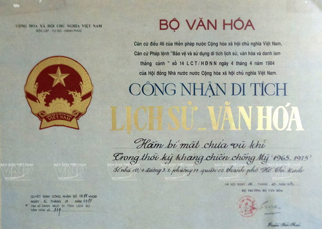 Bằng chứng nhận di tích Lịch sử - Văn hóa “ Hầm bí mật chứa vũ khí trong thời kỳ kháng chiến chống Mỹ 1965 - 1975”.