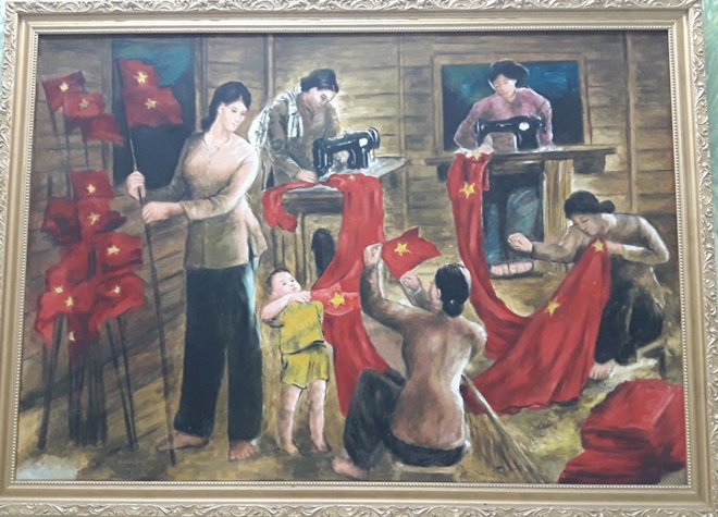 Bức tranh tái hiện lại việc may cờ đỏ sao vàng.